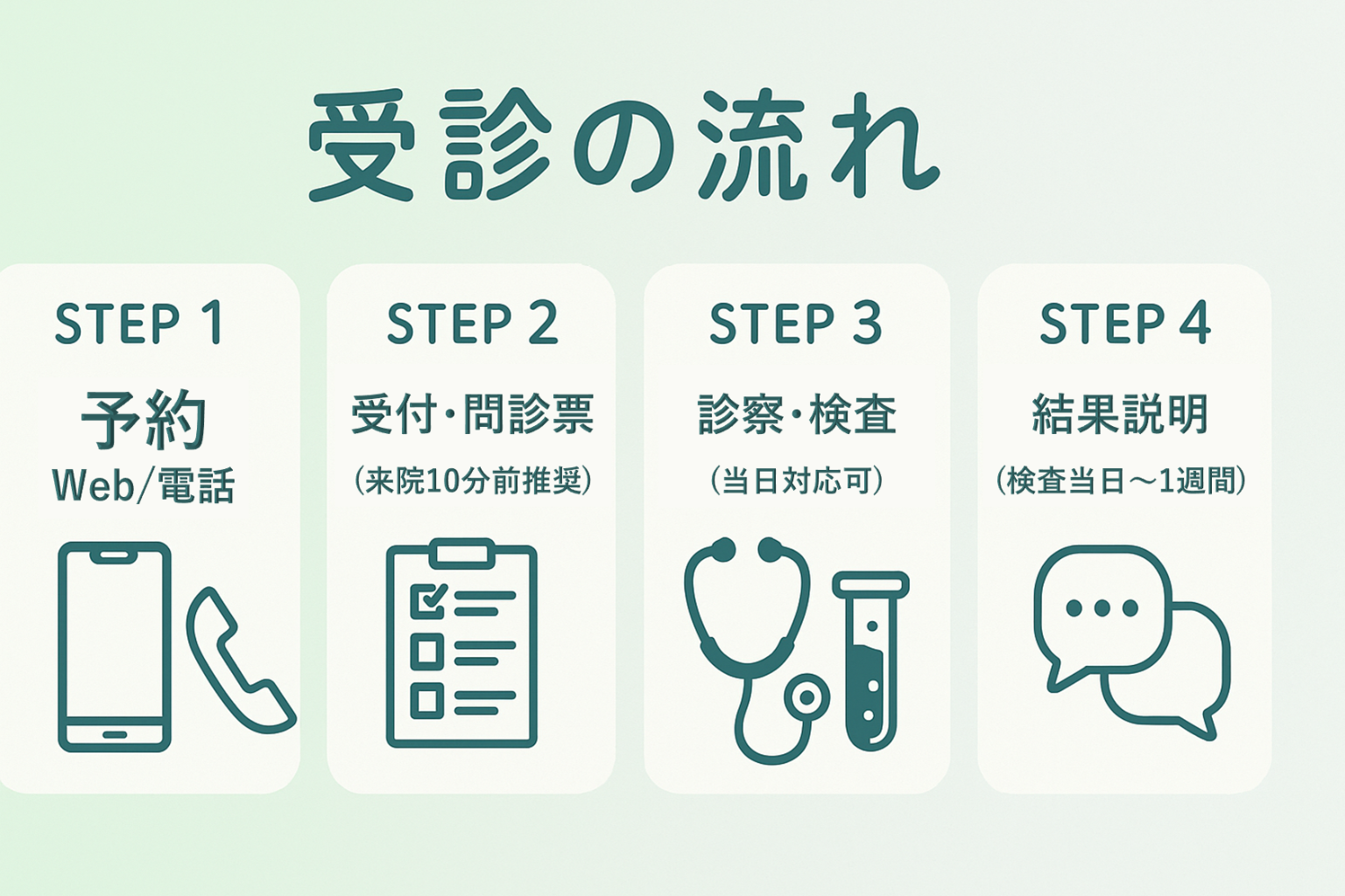 事前予約 → 受付 → 診察・検査 → 結果説明を基本としております。