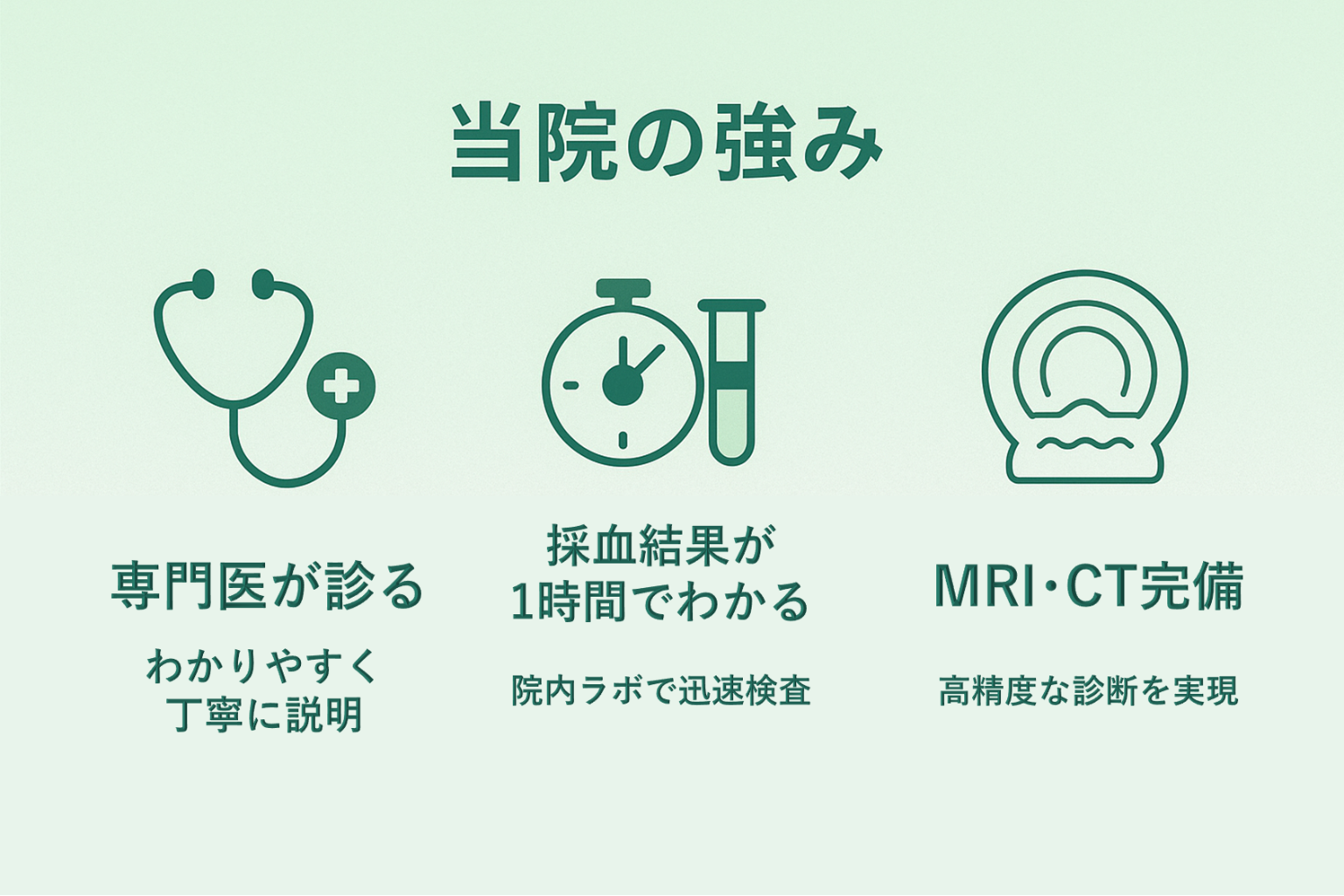 専門医が診察、血液検査を迅速で行う場合は1時間で結果がでて、必要に応じてMRIやCT検査を行います。(MRI/CT完備を基本としています)